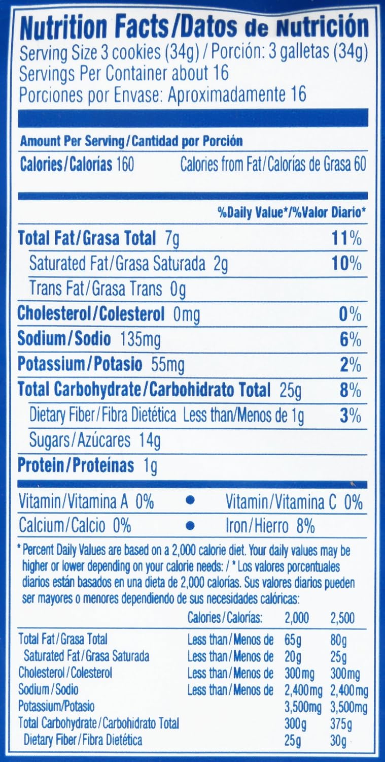 Nabisco Oreo Sandwich Cookies Chocolate 14.3 oz - SmartLabel™ Nabisco Oreo Sandwich Cookies Chocolate 14.3 oz - SmartLabel™ Nabisco Oreo Sandwich Cookies Chocolate 14.3 oz 160 Calories 2 Sat Fat (g) 135 Sodium (mg) 14 Tot Sugars (g) Nutrition Facts About 12 Servings Per container Serving Size 3 cookies (34g) Amount Per Serving Calories 160 % Daily Value * Total Fat 7 g 9.0% Saturated Fat 2 g 10.0%
