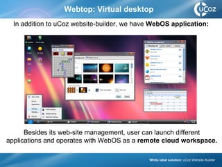 The white label website builder to create your own SaaS The white label website builder is suitable for you to create your own website builder online service (SaaS) or expand your existing service as a reseller. Unlike other white label website builders, the price includes open source code and no subscription. So you pay only once, get the source code, and place it on your own hosting.