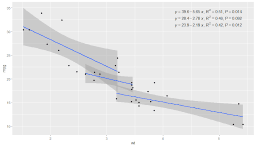R^2 as option in stat_cor() · Issue #32 · kassambara/ggpubr philament commented on Sep 15, 2017. kassambara added a commit that referenced this issue on Aug 11, 2018. Supporting R^2 as an option in stat_cor #32. f082dfc. kassambara added a commit that referenced this issue on Aug 11, 2018. NEWS updated #32. kassambara closed this as completed on Aug 11, 2018. Change Font Size of ggplot2 Facet Grid Labels in R (Example) In the following R syntax, I'm increasing the text size to 30. The larger/smaller this number is, the larger/smaller is the font size of the labels. ggp + # Change font size theme ( strip.text.x = element_text ( size = 30)) Figure 2: Increased Font Size of Labels. stat_regline_equation function - RDocumentation Add regression line equation and R^2 to a ggplot. Regression model is fitted using the function lm .