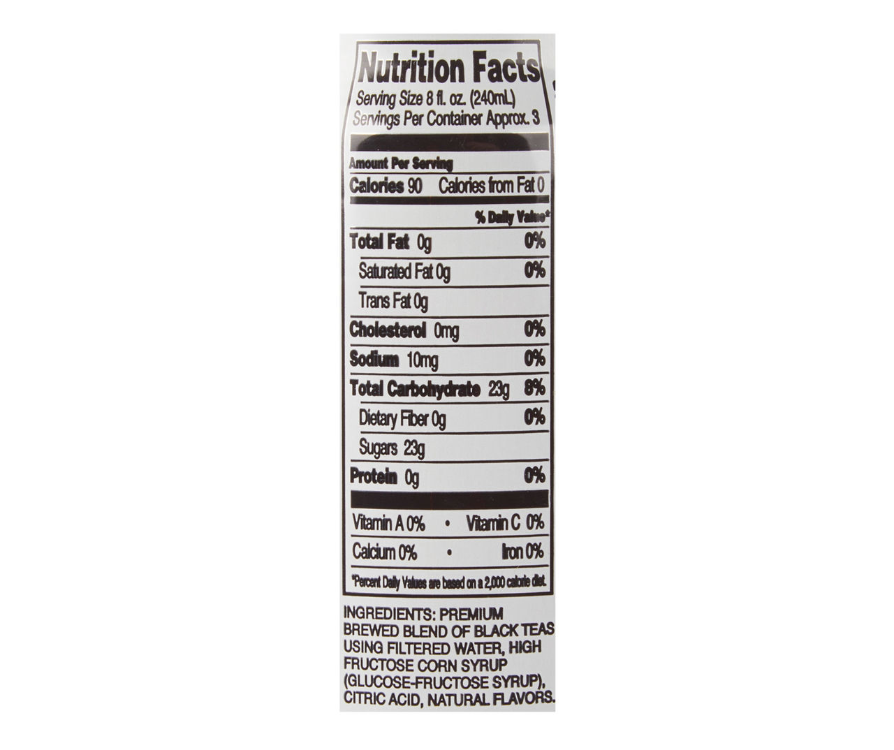 Arizona sweet tea nutrition label. Arizona, sweet tea by Ferolito Vultaggio & Sons nutrition facts and ... Ingredients. Arizona, sweet tea by Ferolito Vultaggio & Sons contains 79 calories per 240 g serving. This serving contains 0 g of fat, 0 g of protein and 21 g of carbohydrate. The latter is 21 g sugar and 0 g of dietary fiber, the rest is complex carbohydrate. Arizona, sweet tea by Ferolito Vultaggio & Sons contains 0 g of saturated fat and 0 ... Is Arizona Green Tea Healthy For You? (You'll Be Surprised) I've seen far too many websites state that a can of Arizona green tea contains 70 calories and 17 grams of sugar. They say that, because that is what is says on the label. What they fail to realize is the serving size. The label is per 8 oz serving. Since a can holds 23 ounces, you need to multiply all of the numbers on the label by 3. Iced Sweet Tea | Sweet Iced Tea | Pure Leaf Sweet Tea. A classic deserves respect, so we paid extra attention to get our Sweet Tea just right. Starting from freshly picked leaves and sweetened with real sugar for a delicious fresh-brewed taste. Available In: 18.5 FL OZ. 59 FL OZ. 64 FL OZ. Nutrition Facts More Information. AriZona Sweet Tea Real Brewed S - Online Groceries | Shaw's Sweet Tea, Southern Style Real brewed. Original brand. 100% natural. No preservatives. No artificial color. No artificial flavor. Visit us at . Facebook. Instagram. Twitter. For more information about Arizona call 1-800-832-3775. An American company. Family owned & operated. Most Popular Customer's Also Bought