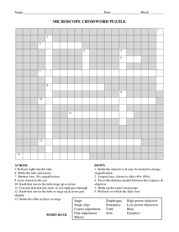 Parts of a Microscope Crossword - printablecreative.com Parts of a Microscope crossword puzzle printable. Download, print and start playing. You can add your own words to customize or start creating from scratch. Recommended: Check out this Advance Crossmaker Maker to create commercial use printable puzzles. Title. Words List (answer : question or clue)