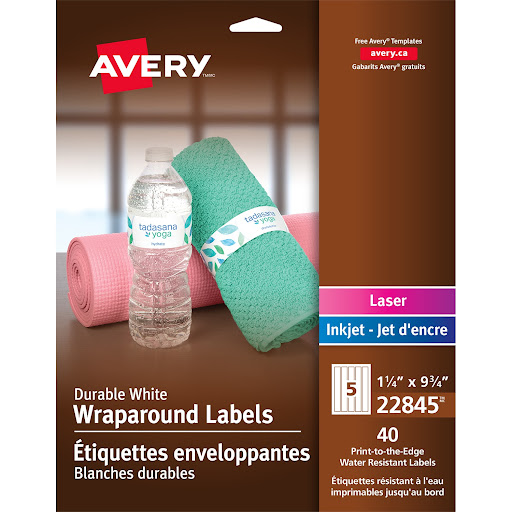 Avery Durable Wraparound Water Bottle Labels, 22845, 9-3/4" x 1-1/4", White Avery ® Durable White Wraparound Labels 9¾" x 1¼", Permanent Adhesive, for Laser and Inkjet Printers Durable White Film (Laser) / White / Permanent 22845 Quantity $ 23.99 Regular Price $ 23.99 Add to Cart Add to Favourites Professionally Printed & Delivered No setup fees 2 day shipping