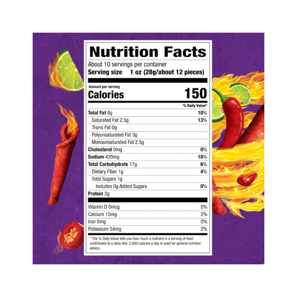 Nutrition Facts for Takis Fuego Rolled Chips • MyFoodDiary® Takis, Nutrition Facts, Serving Size, pieces, 12 pieces = 28g, Amount Per Serving, 150, Calories, % Daily Value*, 12%, Total Fat 8g, 13% Saturated Fat 2.5g, Trans Fat 0g, 0%, Cholesterol 0mg, 18%, Sodium 420mg, 6%, Total Carbohydrate 17g, 4%, Dietary Fiber 1g, Total Sugars 1g, 0%, Includes 0g Added Sugars, Protein 2g, 0% Vitamin D 0mcg,