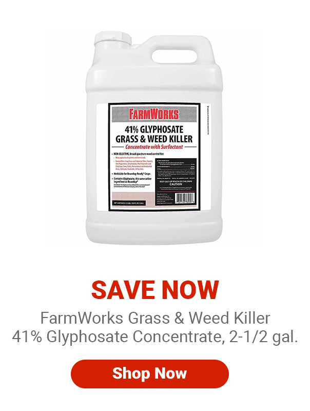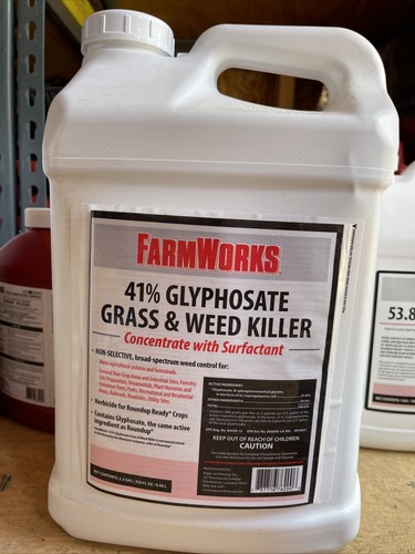 FarmWorks Grass and Weed Killer 41% Glyphosate Concentrate, 2-1/2 gal ... The FarmWorks 76200 Grass & Weed Killer is a non-selective, broad-spectrum weed preventer for many agricultural systems and farmsteads. This weed and grass killer also works on general non-crop areas and industrial sites. Weed preventer contains glyphosate, the same active ingredient used in RoundUp; Extensive agricultural and turf use label Grass and Weed Killer 41% Glyphosate | Ragan & Massey Controlled. FarmWorks 41% Glyphosate Grass & Weed Killer is a non-selective, broad-spectrum herbicide for agricultural, residential and industrial use in non-crop areas. It's been used in forestry site preparation, at plant nurseries, and along roadsides and railroads as a way to keep the plants you want and kill every plant you don't.