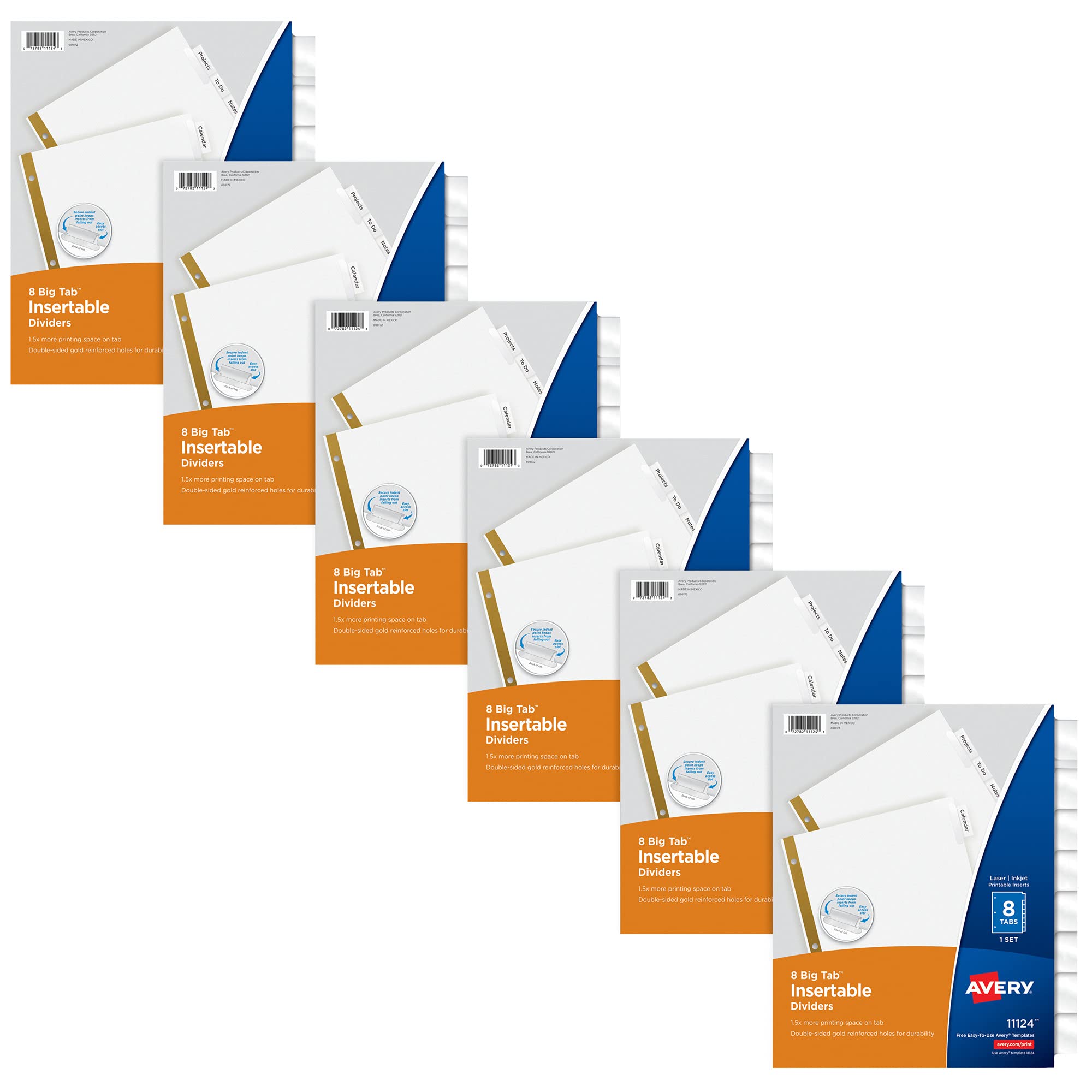 Avery Big Tab Insertable Dividers for 3 Ring Binders, 8-Tab Sets, White Paper, Clear Tabs, 6 Binder Divider Sets (41124)